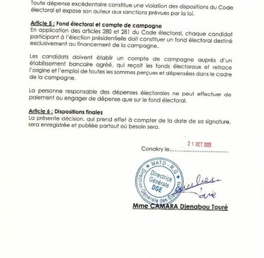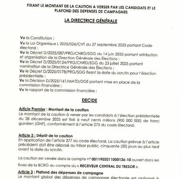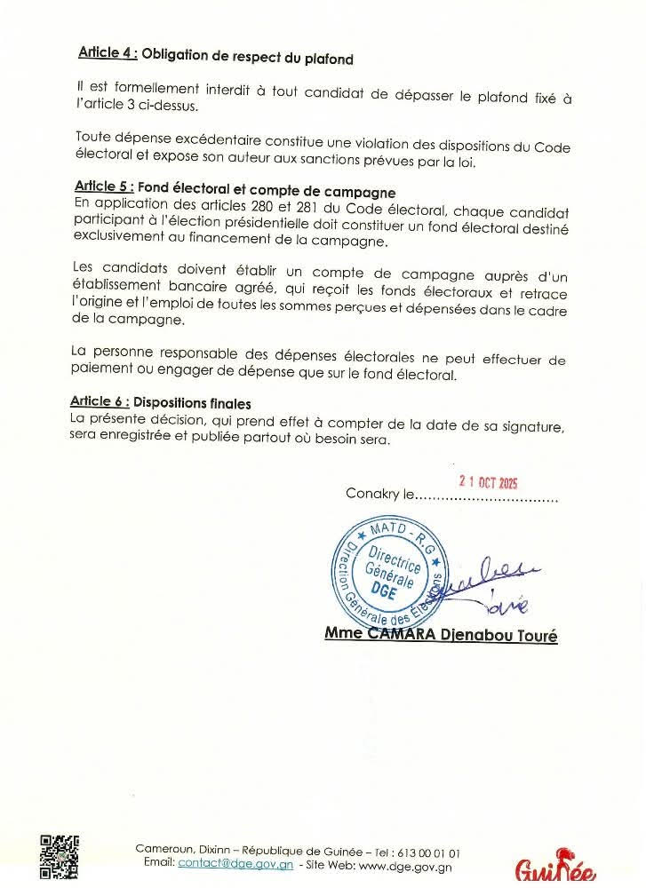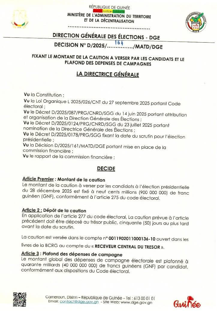 Dans un communiqué lu dans la soirée de ce Mardi à la télévision nationale, Madame Djenabou Touré Directrice générale de la Direction Générale des élections (DGE) a fixée la caution présidentielle à 900.000.000 fg (neuf cent millions de francs guinéens) et le budget de la campagne à 40 milliards de francs guinéens.